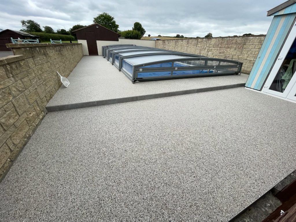 The recent project involved the installation of a resin-bound surface around a swimming pool, creating a stylish, safe, and low-maintenance poolside environment. This innovative surfacing solution offers numerous advantages over traditional materials like concrete or tiles.
